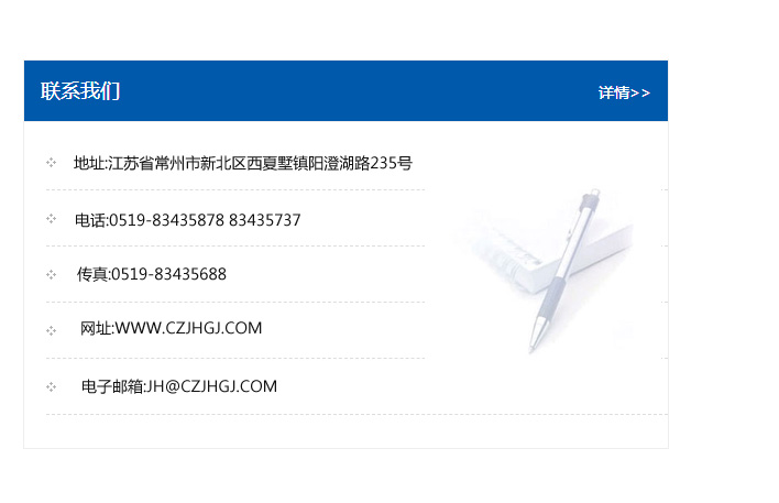 地址:常州市新北區友邦商務大廈1幢16、17層  電話:0519-85101652  傳真:0519-85112595  郵編:213022  網址:www_cz-jiayue_cn.applegogogo.com  郵箱:xiajifengaa@163.com